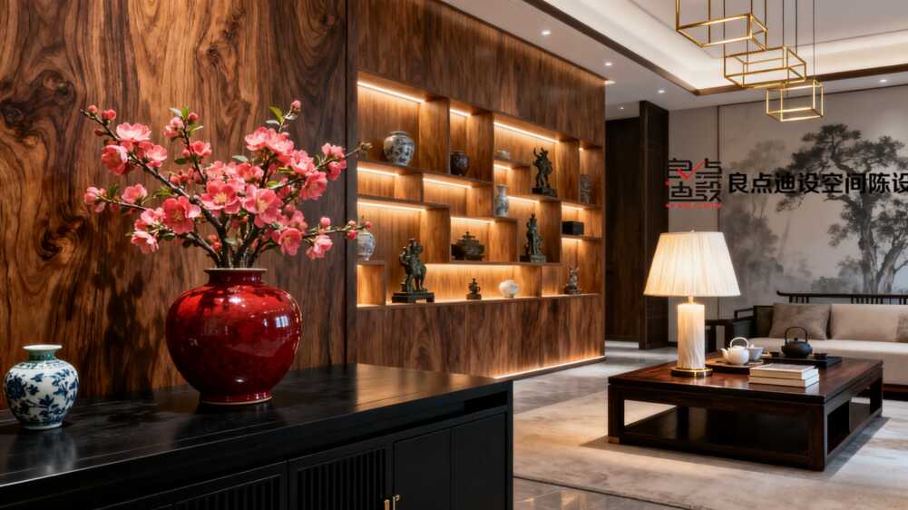 另一侧整墙博古架太会摆了!瓷器、茶罐、小摆件高低错落。暖光灯一打,每件器物都像会讲故事。记住摆七分满留三分白,透气感才是关键。