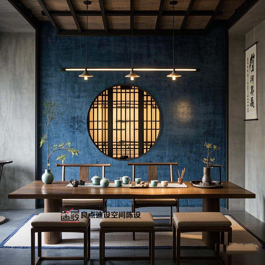 深蓝木色王炸组合!这家茶室把新中式茶楼茶馆装修软装设计玩出高级感