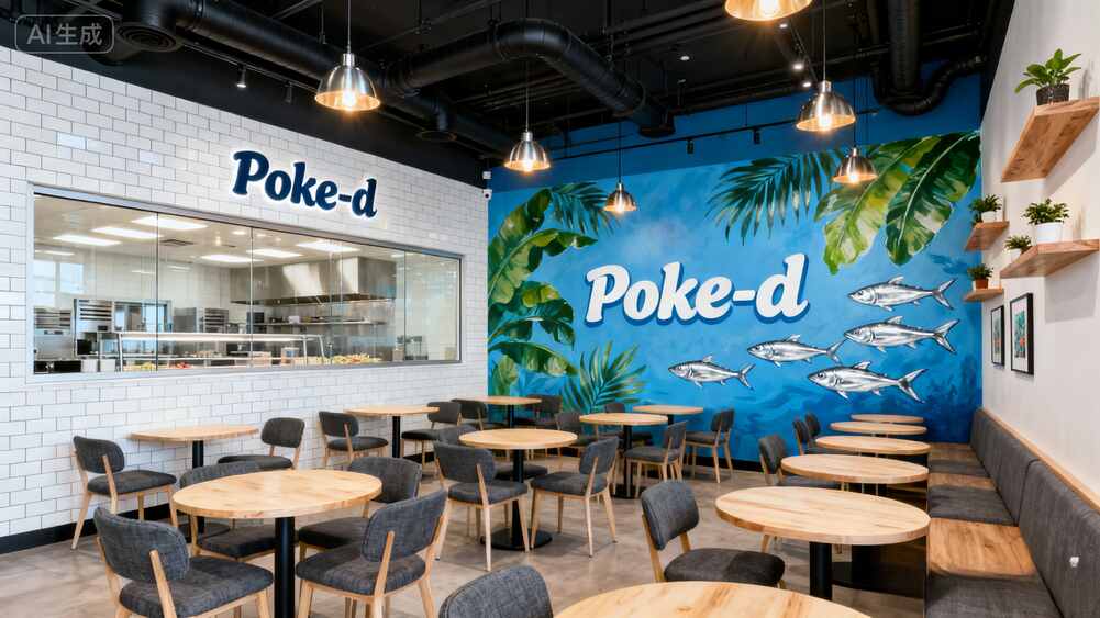 宝子们!今天要安利这家让我一进门就惊叫的Poké-doke餐厅!整面墙直接把海底世界搬来了——蓝色海浪里游着五彩鱼儿,"Poké-doke"的立体字母像是从海里浮出来的,搭配绿植点缀,度假感瞬间拉满!