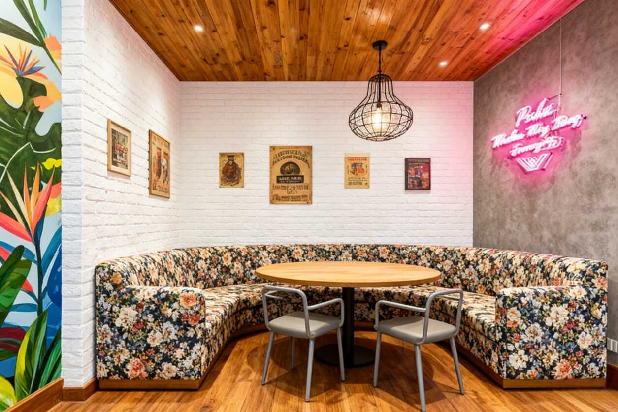 虽然元素多,但主色调其实很克制:地毯的暖色、沙发的蓝、绿植的绿,再点缀一面吸睛的粉红霓虹墙——“EAT GOOD FEEL GOOD”标语直接点题,复古俏皮还能引导顾客拍照传播。这波操作,老板***是懂营销的!