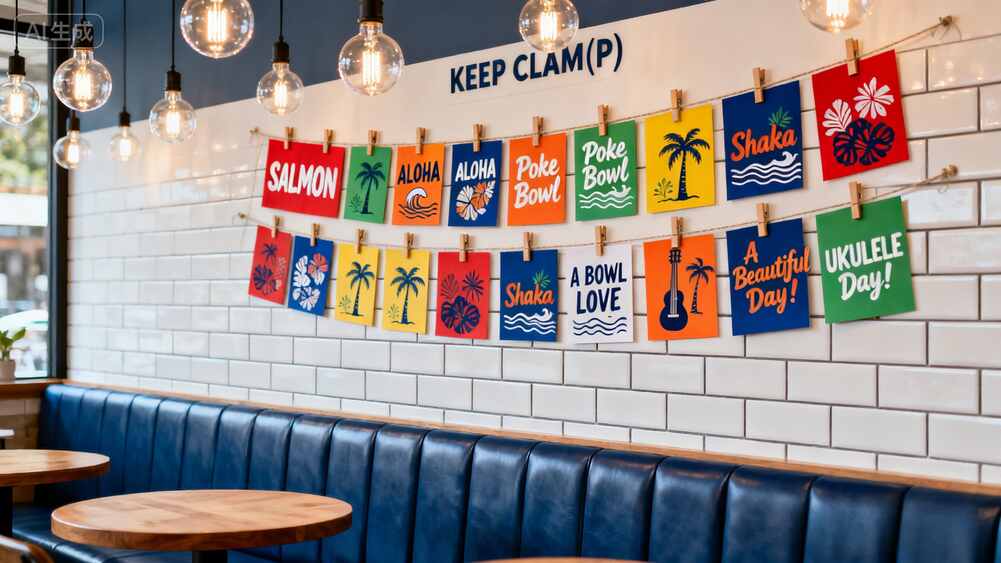 这家Poké-doke餐厅软装设计把海边度假风玩明白了!蓝白配色+藤编元素,随手一拍就是ins大片