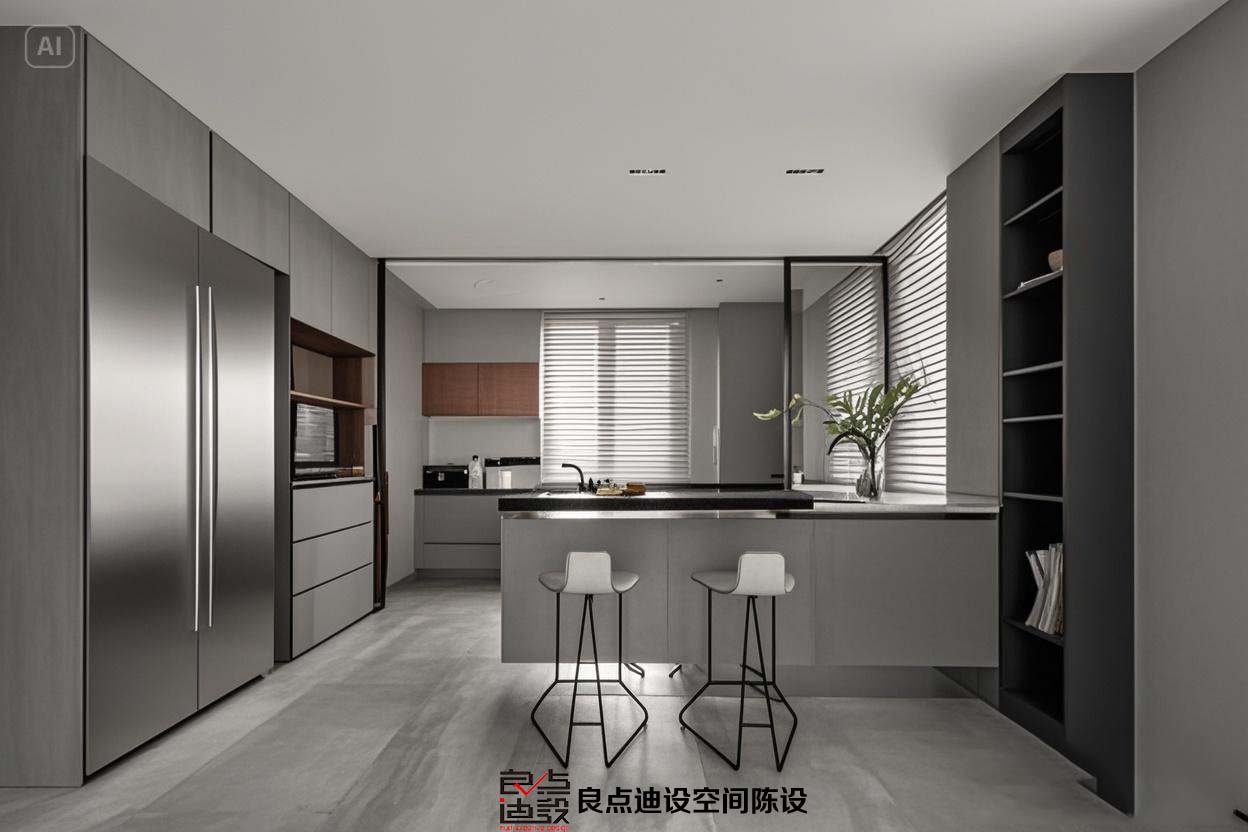 厨房以使用功能为主,顶面为石膏板吊顶,橱柜采用镜面烤漆咖色柜门,乳白色大理石台面,咖色的地砖很耐脏。