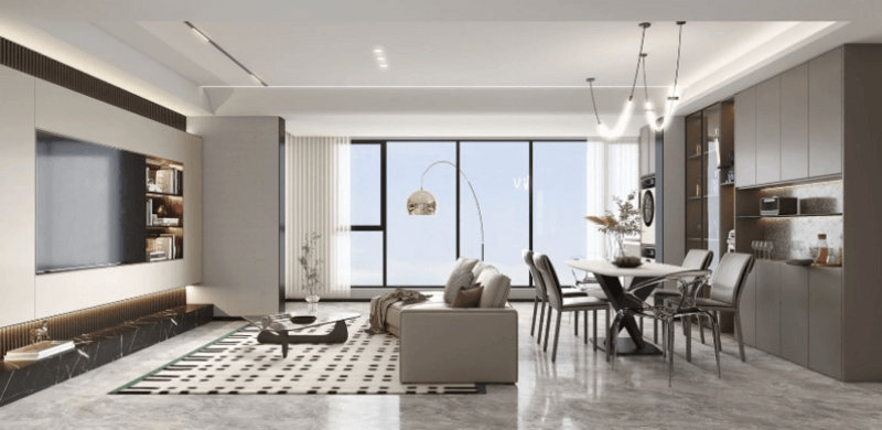 2、客餐厅一体式,选择三人位沙发搭配边椅,更加灵活;以沙发作为软隔断,餐厅根据家庭需求选择多人位;